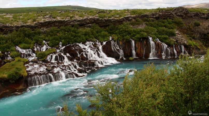 Our next stop is at the beautiful lava cascades Hraunfossar waterfalls, which actually are streaming through rivulets in the lava field and into the glacier river Hvítá.