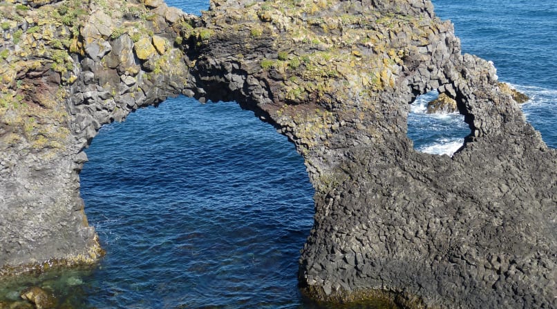 We have craters Eldborg, hot springs, where you could take a bath in, nice cold mineral water coming from the ground where you can refilled your waterbottle, basalt seacliffs Lóndrangar, huge gorge Rauðfeldsgjá, historic black volcanic sand beach Djúpalónssandur beach, the old fishing villages Arnarstapi and Hellnar with these amaizing rock formations in the seacliffs,